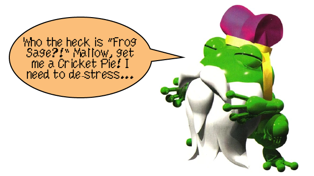 Now, if you peruse an online forum here and there, Internet scholars will let everyone know that the Japanese name for Frogfucius in the original Super Famicom version of Super Mario RPG is more in line with “Frog Hermit,” thus making “Frog Sage” a much closer and more accurate approximation of blah blah blah.