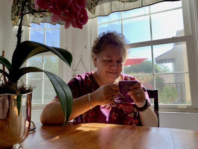 My mom playing games in the kitchen.