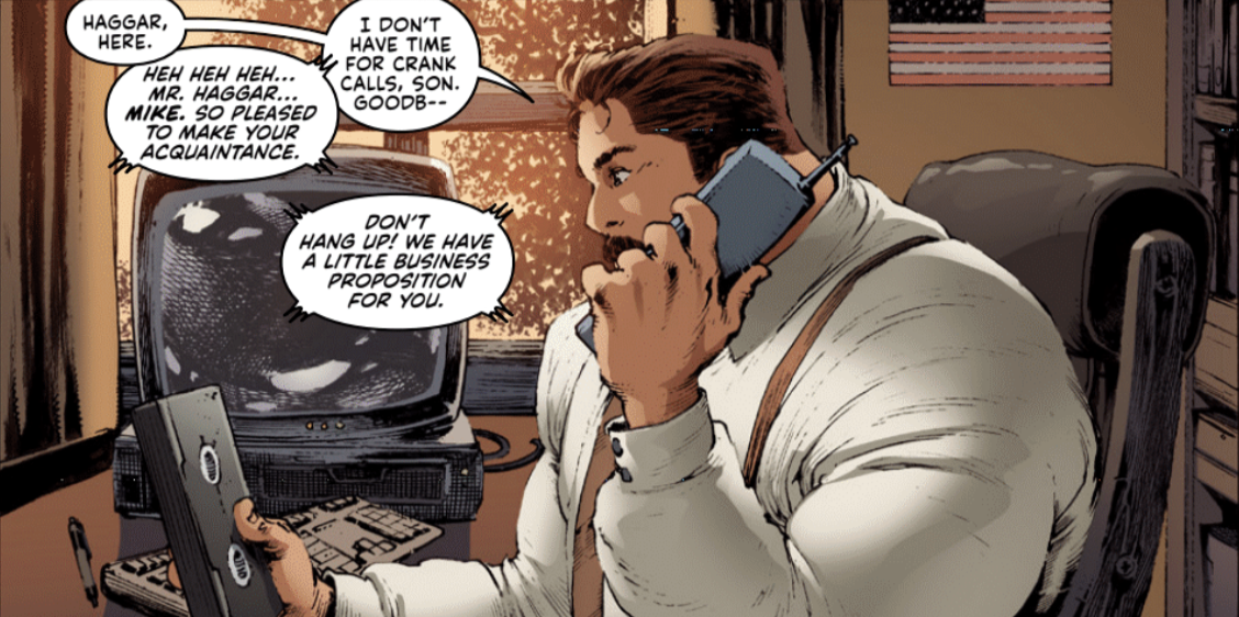 UDON is back with another series based on a popular Capcom IP. This time around it’s Final Fight, a miniseries written by Matt Moylan and illustrated by Matthew Weldon. One of the more charming aspects about the series even before it came to shops was seeing the homage variant covers based on famous movie posters. Final Fight #1 embraces the series ’80s roots and starts things off in 1989 with Mayor Mike Haggar taking office for the first time. As he sits down at his desk he discovers a VHS tape (remember those?) and then gets a mysterious phone call telling him to watch it. Lo and behold, Haggar’s daughter Jessica has been taken captive by the nefarious Mad Gear Gang. If Haggar agrees to let them carry on with their criminal dealings, they’ll let Jessica go. Haggar, of course, is having none of that, and calls upon Cody Travers (joined by his good buddy, Guy), Jessica’s boyfriend, to help him rescue her.
