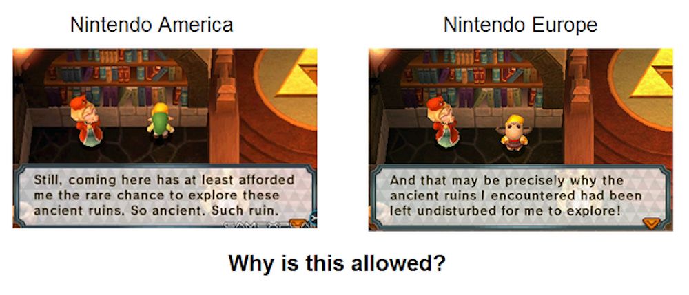 It’s no secret that Treehouse’s localizations can be laugh-out-loud funny, but there’s one area people feel they’ve gone too far in: the inclusion of Internet memes. Just look at the above example from The Legend of Zelda: Tri Force Heroes: as you can see, the European version goes for a literal translation, while Treehouse opted to reference the “doge” meme, albeit with more of a “ancient ruin” theme. So concern. Such controversy.
