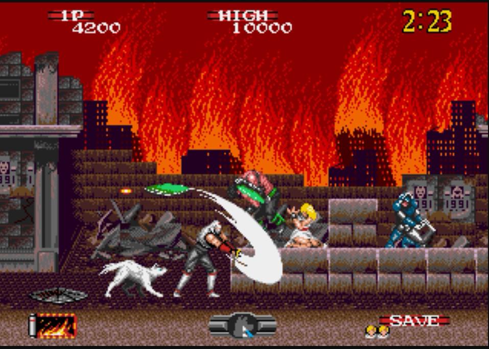 There was only one arcade sequel to Shinobi, 1989’s Shadow Dancer. As the two year gap would suggest, Shadow Dancer is aesthetically more striking and features some new quirks. The protagonist now wears distinctive white robes and has a white dog, Yamato, as a companion. Yamato can help with enemy takedowns when the player performs a crouching attack while Yamato is barking. This does unfortunately mean that the player will often deploy Yamato accidentally. Even aside from Yamato’s overeagerness, Shadow Dancer is just a clunkier game than the original and is harder to recommend. It is not available on Switch.