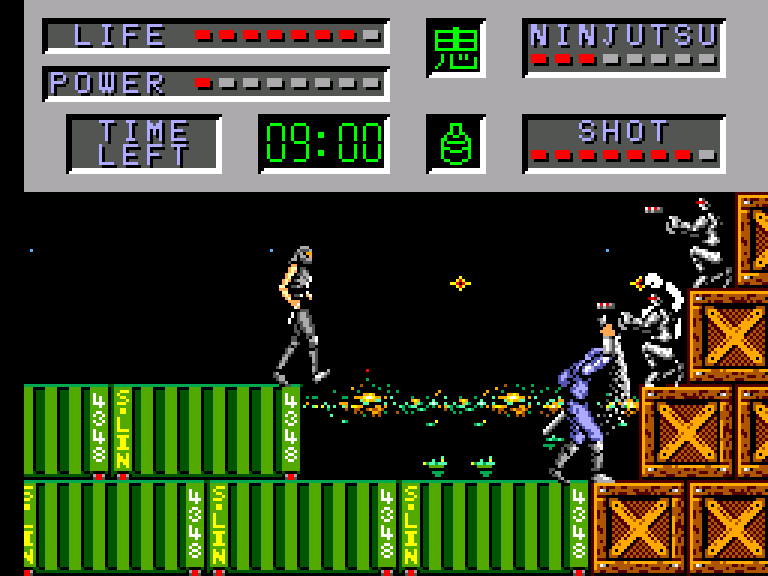 One distinctive feature of all the classic Shinobi games is a focus on ranged combat over melee combat, though melee combat is also part of the game. As in the arcade-style titles, Joe performs a melee attack only if a target is in melee range. Otherwise, he throws his kunai. His kunai are limited and the player needs to scrounge up ammunition. If Joe attacks while at the peak of a double jump, he will spend eight kunai at once to throw out a fan of kunai, as a sort of mini screen clearing attack with the added utility of allowing him to attack at angles he otherwise cannot. The eight kunai cost is not something that Joe can regularly afford, though, so careful consideration is required. This interacts with the POW powerup item, which boosts Joe’s kunai damage in addition to allowing him to block enemy projectiles, and which Joe loses when hit a single time. The POW item is hard to hold onto for a novice (unless they use Ikazuchi), but for an experienced player it allows them to use fans of kunai more often. It’s a clever system that evolves the player’s gameplay as they get better at the game.