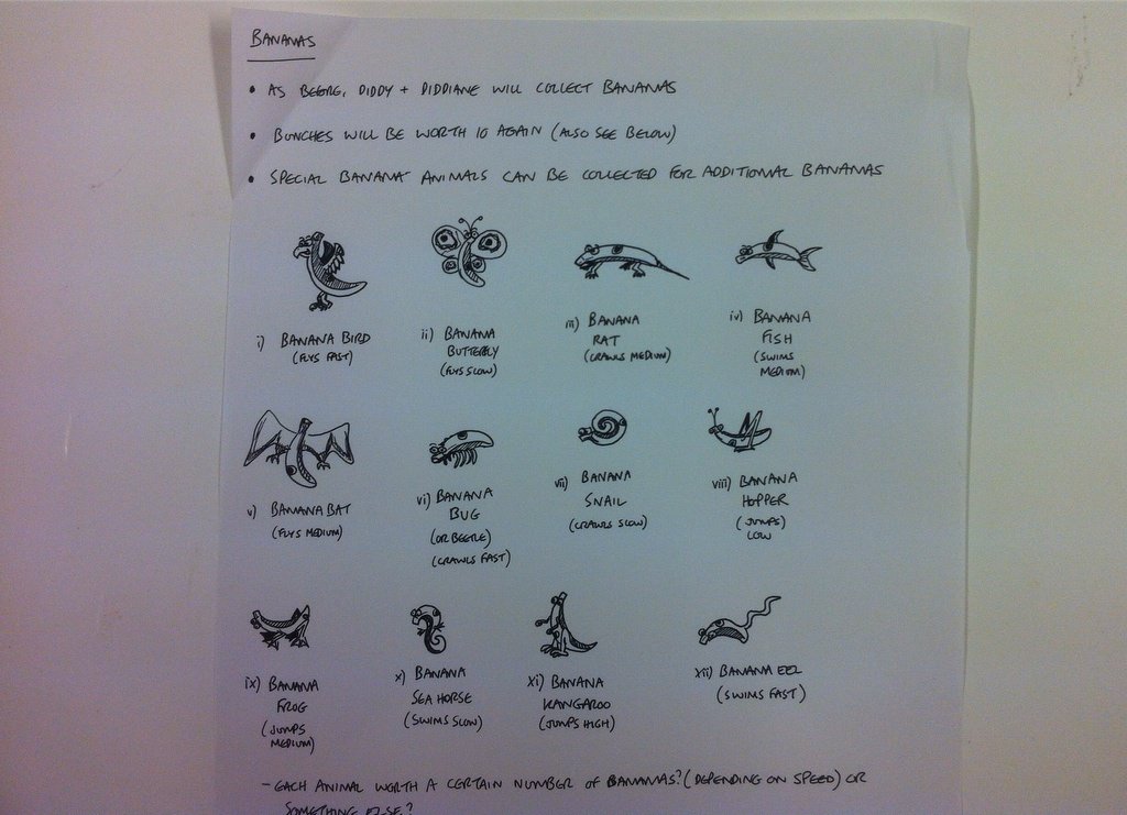 The original Donkey Kong Country introduced a group of animal friends that could assist Donkey and Diddy in their travels. The sequel expanded upon those characters, but apparently more were also going to be introduced. “Banana animals” were at one point considered for the game, with at least twelve different characters in early design stages. Mayles has also revealed a number of concept sketches, level layouts and a lot more!