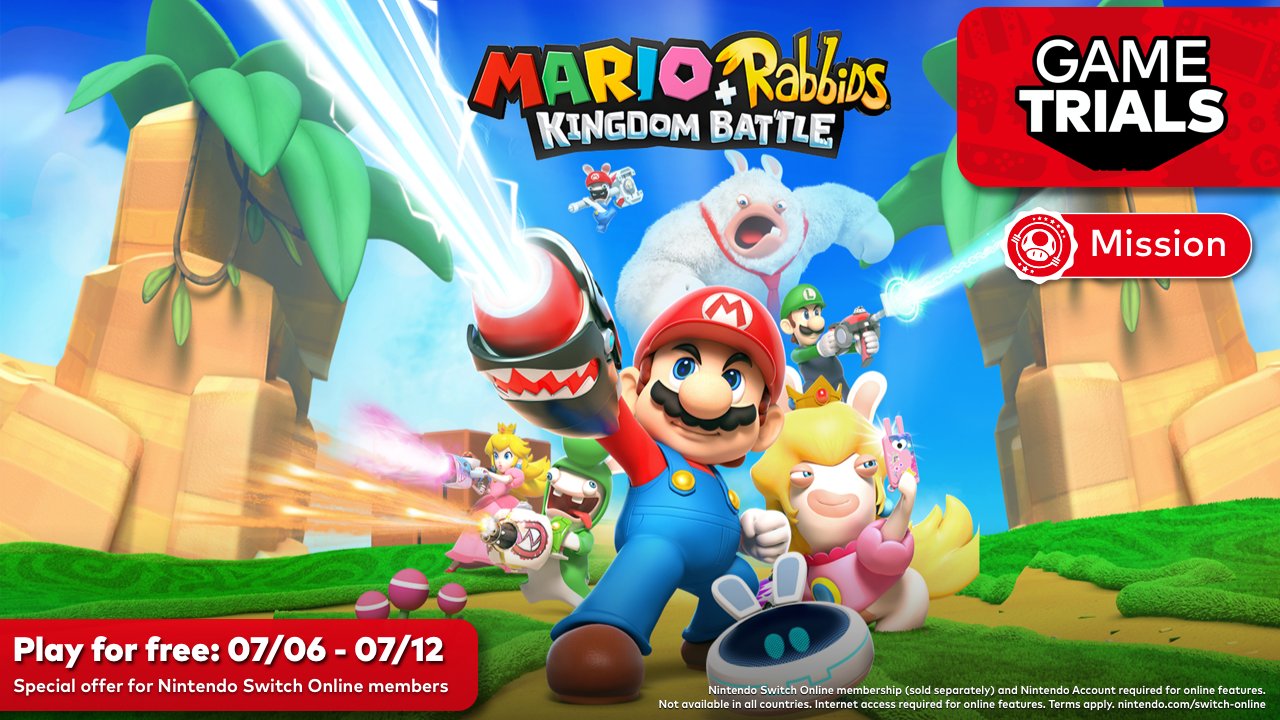 #NintendoSwitchOnline members! From 7/6 at 10 a.m. PT to 7/12 at 11:59 p.m. PT, you can download and try the full Mario + Rabbids Kingdom Battle game at no additional cost.
