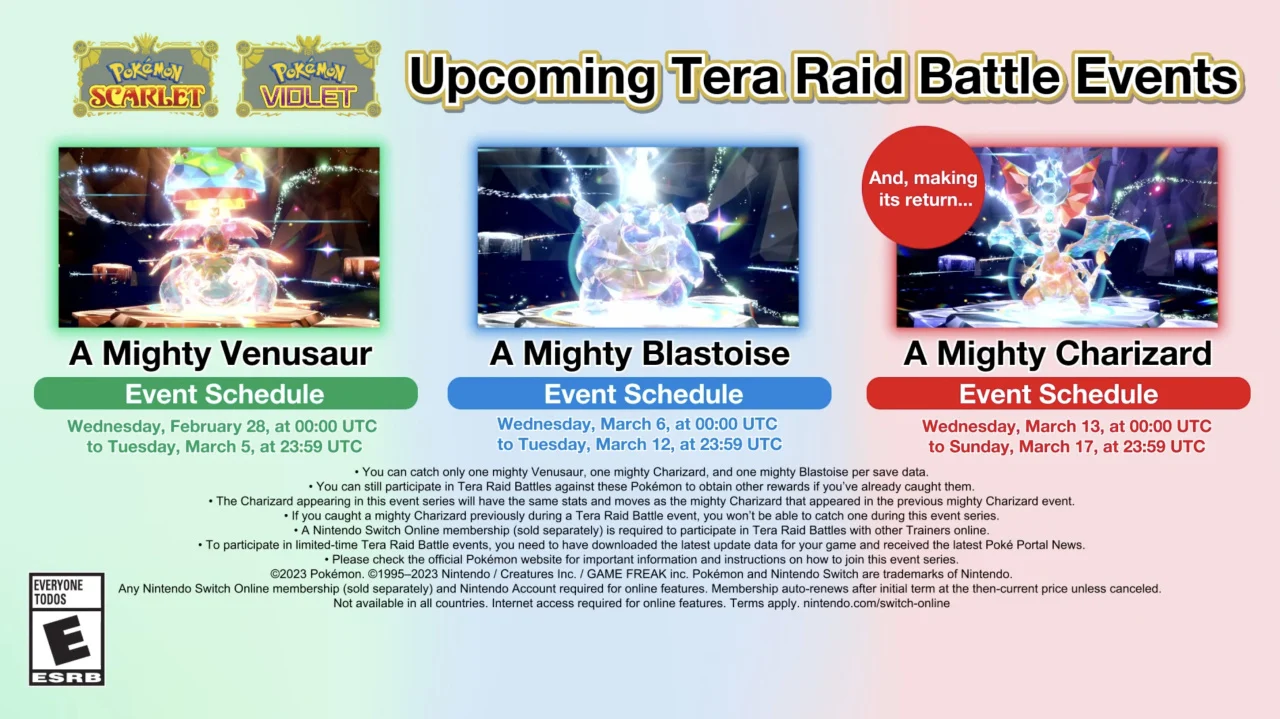A mighty trio is headed to the Pokemon Scarlet and Pokemon Violet games. Be prepared to go against Mighty Blastoise, Mighty Venusaur, and Mighty Charizard starting tomorrow. Players will be given a chance to capture each of these powerful Pokémon beginning February 28, 2024.
