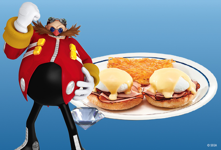 - Dr. Eggman’s Benedict: A 300 IQ genius like Eggman knows that black forest ham, poached eggs & hollandaise sauce make for a superior meal.