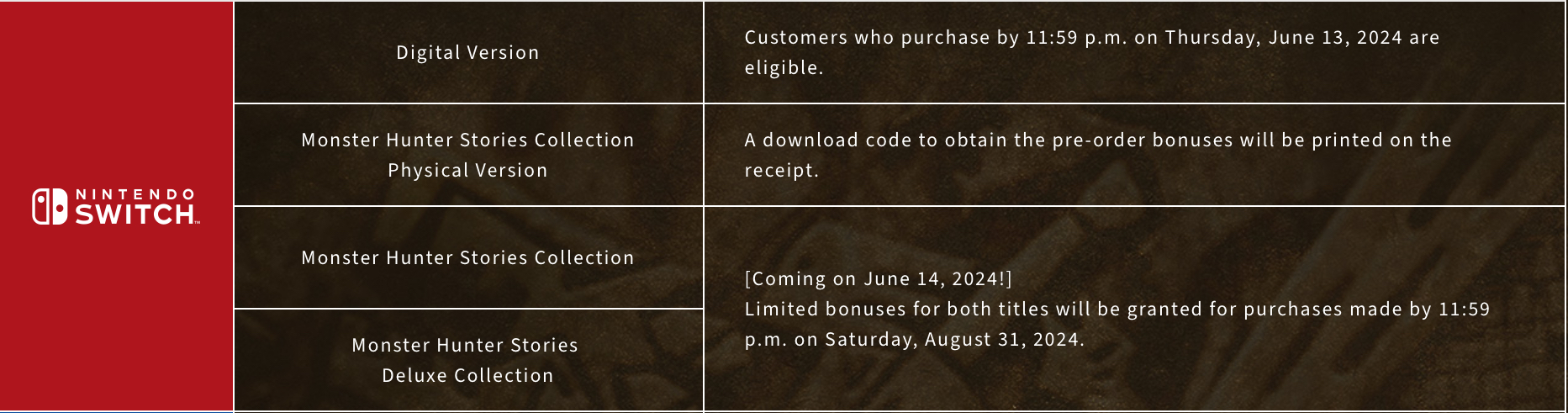 If you’ve pre-ordered the game (and there’s still some time left to do so) you’ll get the following for each version of Monster Hunter Stories:
