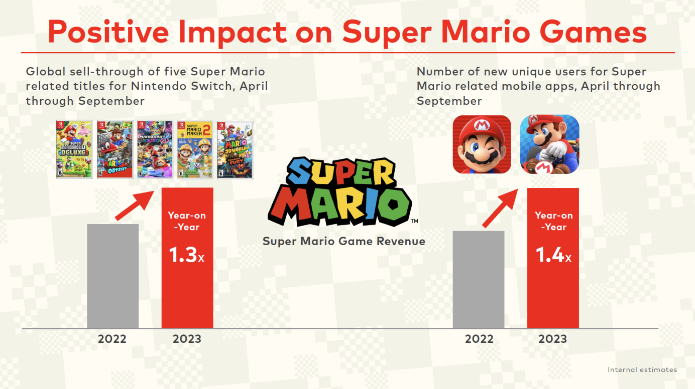 The Super Mario Bros. Movie wasn’t just a hit as a film, it was also a boon to Nintendo in terms of boosting sales and brand awareness. According to the company’s recent financial briefing, The Super Mario Bros. Movie provided a year-on-year 1.3 times bump in sales of five Mario games: New Super Mario Bros. U, Super Mario Odyssey, Mario Kart 8 Deluxe, Super Mario Maker 2, and Super Mario 3D World Deluxe. All of these titles saw an appreciable increase in sell-through, which Nintendo is attributing to the popuarity of the film.