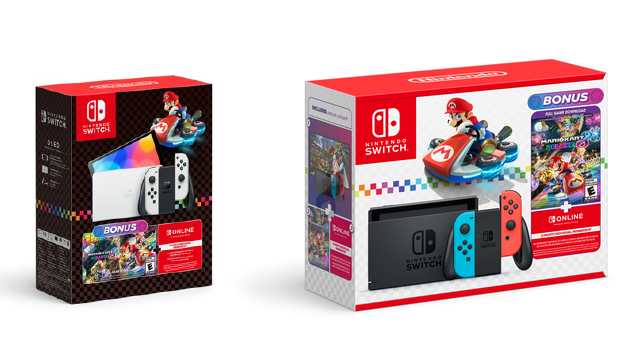 - Includes a Nintendo Switch system with Neon Red and Neon Blue Joy-Con, a download code for Mario Kart 8 Deluxe, and a 12-month Nintendo Switch Online Individual Membership.
