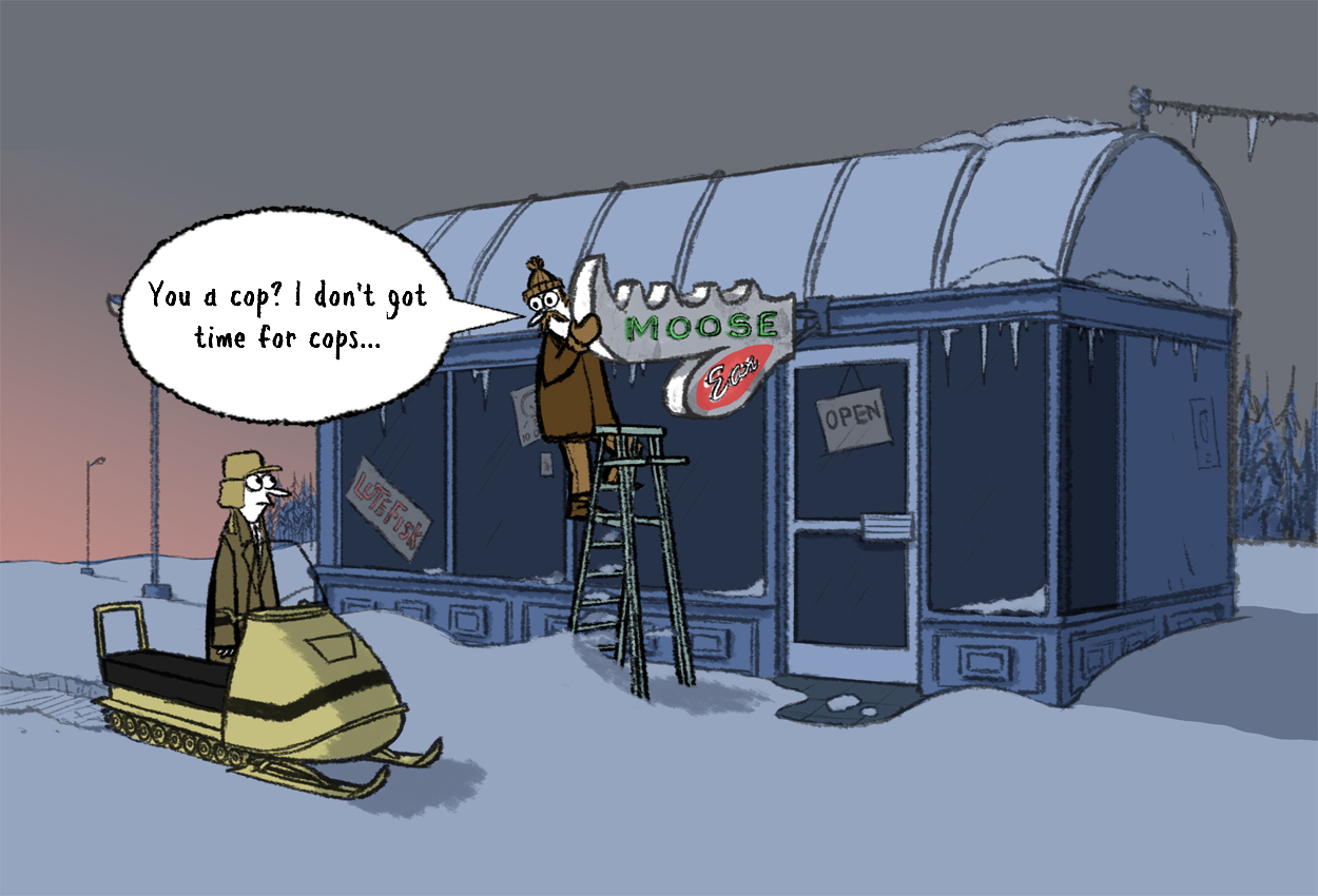 In case you don’t know, I work for the F.B.I. in the Department of Puzzle Investigation. When an enigma crops up, I am the first line of reasoning consulted for the job. Crossword puzzles, puzzle balls, Rubik’s cubes, even the occasional Sudoku puzzles: I’ve seen them all. However, the subject of this story is my trip to Scoggins, Minnesota to investigate the mysterious closing of the eraser factory there, since it’s the very location where the White House’s supply of erasers comes from. Of course, the story is not from my official report, but is instead a reasonable facsimile produced by Mr. Graham Annable, who you may know from doing the Grickle series on YouTube. I must say that Mr. Annable captured the people very well, from the Scandinavian heritage displayed by many of the Scoggins residents to the down-to-earth demeanor of others. It is an excellent retelling of my story.