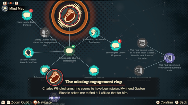 Starting with the character profiles feature, while not completely necessary to gameplay, it does help keep track of who is who, and what role they play in the overall story. It also allows you to re-read dialogue in case you may have missed anything. It definitely played a bigger role in the prologue than in the other chapters I played, as it is no longer prompted. Once you have all the pieces of someones character profile correctly placed, it will check them off. This happens gradually over the course of the game. Next is the confrontation system, which is not as prominent in my opinion. During dialogue, sometimes you learn conflicting information in previous conversations, so you have the opportunity to go back and confront them about lying. All you have to do is find the lie, and confront them with the conflicting statement. It is much more simple, but still plays a prominent role in gameplay. Now, let’s talk about the mindmap.